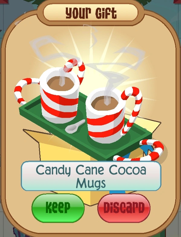Candy Cane Cocoa Mugs. It was first released in April 2012 as one of the Monthly Member Gifts. Last Updated 8820 The items on this page have less common variants that are not featured on this wiki.